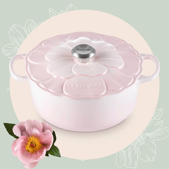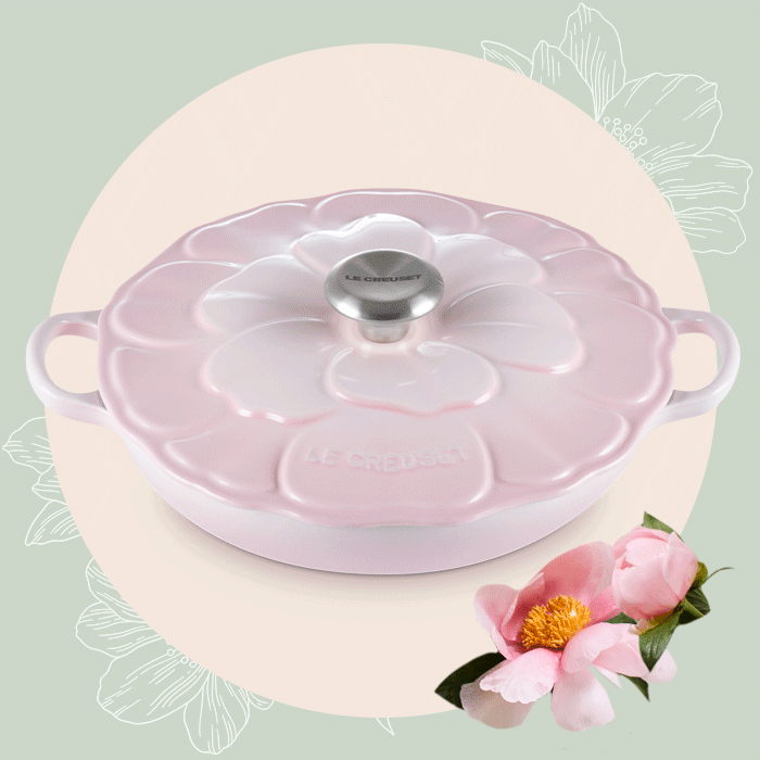 At the heart of this selection is the iconic cast iron cocotte, reimagined in a floral silhouette that captivates at first glance.
